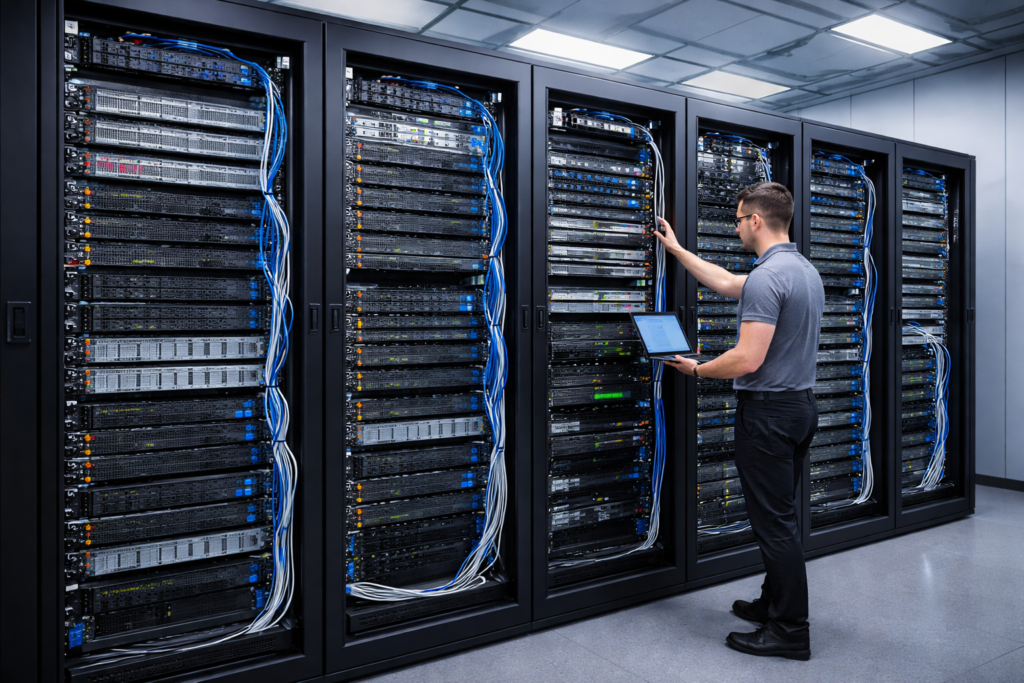 Standards-compliant server room design and installation with secure racks, cabling, power backup, cooling, and safety systems.